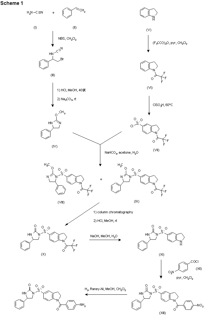 The bromination of styrene (II) with N-bromosuccinimide in the presence of cyanamide (I) provided 2-bromo-1-phenylethylcyanamide (III). Further addition of MeOH to (III) in the presence of HCl, followed by Na2CO3-promoted cyclization, produced the methoxyimidazoline (IV). Acylation of indoline (V) with trifluoroacetic anhydride and pyridine gave amide (VI) and subsequent chlorosulfonation yielded sulfonyl cloride (VII). This acid chloride was coupled to imidazoline (IV) in the presence of NaHCO3 in aqueous acetone to furnish a mixture of sulfonyl imidazolines (VIII) and (IX). The major isomer (IX) was isolated by column chromatography, and then, hydrolysis with HCl in MeOH at r.t. provided imidazolidinone (X). The trifluoroacetamide group of (X) was further hydrolyzed by treatment with NaOH in aqueous MeOH to give (XI). Subsequent condensation of (XI) with 4-nitrobenzoyl chloride (XII) in the presence of pyridine yielded 4-nitrobenzamide (XIII), which was finally reduced to the aminobenzamide by hydrogenation using Raney-nickel as the catalyst.