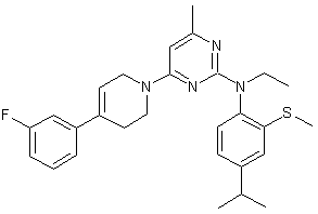 The Grignard reaction of 1-(tert-butoxycarbonyl)piperidin-4-one (I) with 3-fluorophenylmagnesium bromide (II) in THF gives the tertiary alcohol (III), which is dehydrated with TFA or HCl in dioxane yielding the tetrahydropyridine (IV). The condensation of (IV) with 2,4-dichloro-6-methylpyrimidine (V) by means of DIEA in ethanol affords 2-chloro-4-[4-(3-fluorophenyl)-1,2,3,6-tetrahydropyridin-1-yl]-6-methylpyrimidine (VI), which is further condensed with 4-isopropyl-2-(methylsulfanyl)aniline (VII) by means of DIEA in refluxing ethylene glycol to give the secondary amine (VIII). Finally, this compound is alkylated with ethyl iodide and NaH in DMF.