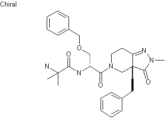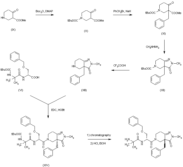 Methyl 4-oxopiperidine-3-carboxylate (IX) was protected as the tert-butyl carbamate (X) with Boc2O. This was alkylated with benzyl bromide in the presence of NaH to provide the racemic benzyl derivative (XI). Subsequent cyclization of (XI) with methylhydrazine produced the pyrazolopyridine (XII), which was deprotected with trifluoroacetic acid. The resulting amine (XIII) was then coupled with dipeptide (VI) using EDC and HOBt to afford the diastereomeric amides (XIV). After chromatographic isolation of the (R,R)-diastereoisomer, acid deprotection of the Boc group furnished the title compound.
