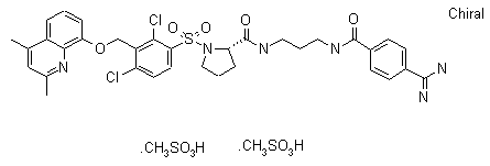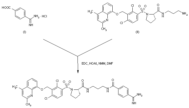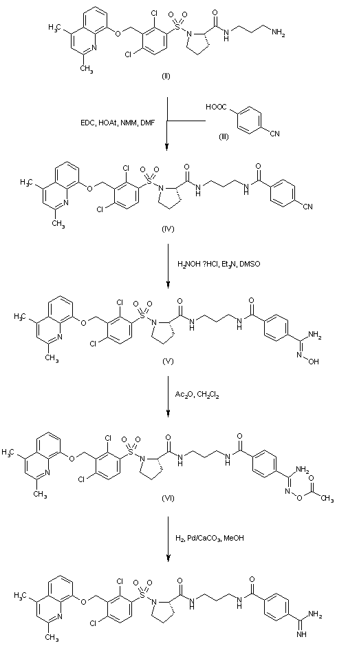In an alternative procedure, amine (II) was condensed with 4-cyanobenzoic acid (III) to give amide (IV). Subsequent addition of hydroxylamine to the cyano group of (IV) afforded N-hydroxy amidine (V), which was acetylated with Ac2O to produce (VI). This compound was finally reduced to the target amidine by hydrogenation over Lindlar catalyst.