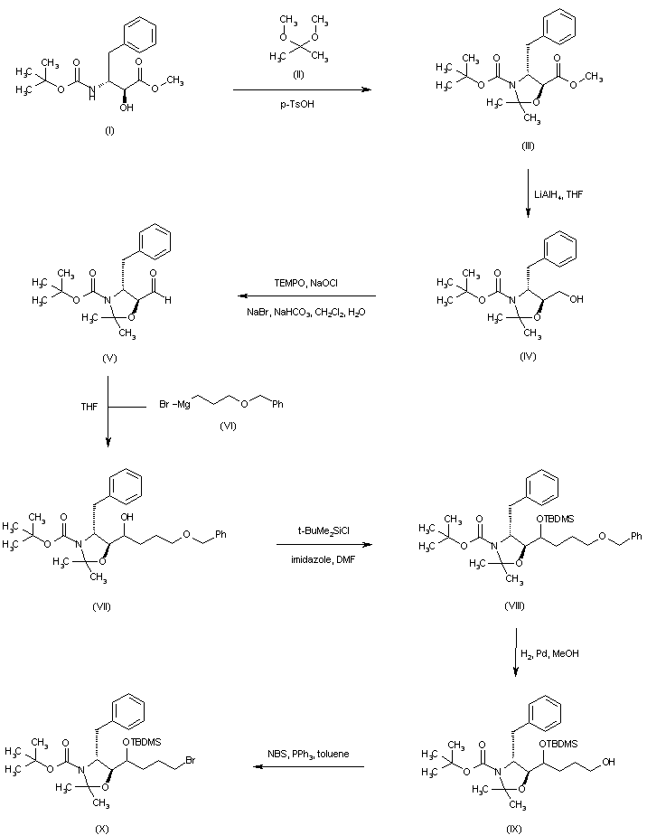 Hydroxy amino ester (I) was protected as the oxazolidine (III) upon heating with 2,2-dimethoxypropane (II) in the presence of p-toluenesulfonic acid. Conversion of the ester group of (III) into aldehyde (V) was accomplished by reduction to alcohol (IV) with LiAlH4, followed by NaOCl oxidation catalyzed by 2,2,6,6-tetramethyl-1-piperidinyloxy free radical (TEMPO) and NaBr. Addition of 3-(benzyloxy)propylmagnesium bromide (VI) to aldehyde (V) furnished carbinol (VII), which was further protected as the silyl ether (VIII) by treatment with tert-butyldimethylsilyl chloride and imidazole. After hydrogenolysis of the O-benzyl protecting group of (VIII), the resultant primary alcohol (IX) was converted to bromide (X) employing the N-bromosuccinimide/triphenylphosphine reagent.