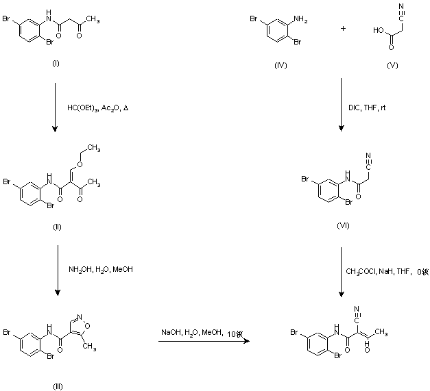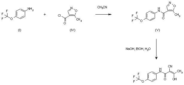 Alternatively, aniline (I) was coupled with 5-methylisoxazole-4-carbonyl chloride (IV) to provide the isoxazolecarboxamide (V). The isoxazole ring was then opened with NaOH to furnish the target cyanopropenamide.