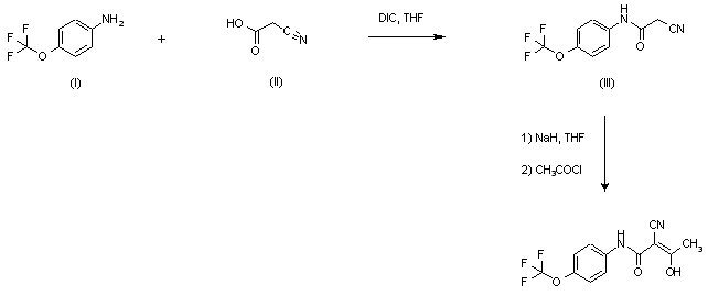 Two synthetic ways have been reported for the compound. Coupling of cyanoacetic acid (II) to 4-(trifluoromethoxy)aniline (I) in the presence of diisopropylcarbodiimide formed the cyanoacetamide (III), which was treated with NaH and then acylated with acetyl chloride to yield the title compound.