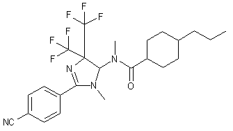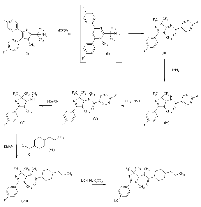 The oxidative ring opening of diphenylimidazole (I) with m-chloroperbenzoic acid (MCPBA) in refluxing chloroform or dichloromethane gives the intermediate, not isolated, bisbenzamide (II), which by acid catalyzed dehydrocyclization yields the imidazoline (III). The hydrogenation of the exo double bond of (III) with LiAlH4 in methanol affords N-imidazolinylbenzamide (IV), which is methylated with methyl iodide and NaH in DMF to provide the N-disubstituted benzamide (V). The hydrolysis of benzamide (V) with potassium tert-butoxide gives the seconday amine (VI), which is acylated with 4-propylcyclohexylcarbonyl chloride (VII) by means of DMAP and triethylamine or pyridine in dichloromethane or dichloroethane to yield the amide (VIII). Finally, this compound is treated with LiCN, KI and K2CO3 in DMSO at 130-40 C.