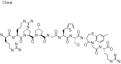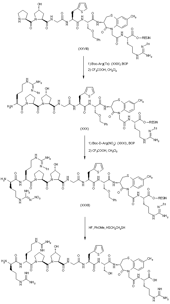 Peptide resin (XX) was subjected to sequential coupling-deprotection cycles with the following amino acids: N-Boc-(2-thienyl)alanine (XXI), N-Boc-glycine (XXIII), N-Boc-4-hydroxyproline (XXV), N-Boc-proline (XXVII), Nalpha-Boc-NG-tosyl-arginine (XXIX) and Nalpha-Boc-NG-nitro-D-arginine (XXXI) to produce peptide resins (XXII), (XXIV), (XXVI), (XXVIII), (XXX) and (XXXII), respectively. The title peptide was finally obtained by deprotection and cleavage from the resin by means of treatment with HF.