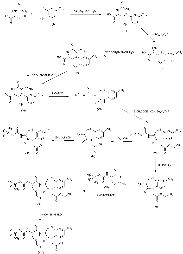 Alkylation of N-acetyl-D-cysteine (I) with 1-fluoro-5-methyl-2-nitrobenzene (II) gave adduct (III). After hydrolysis of the acetamido group of (III) with aqueous sulfuric acid, the resulting amine (IV) was protected as the benzyl carbamate (V). Reduction of the nitro group of (V) provided amino acid (VI), which was cyclized to the benzothiazepinone (VII) using EDC. Subsequent alkylation of (VII) with ethyl bromoacetate under phase-transfer conditions yielded (VIII) (1). Cleavage of both N-Cbz group and ethyl ester by HBr in AcOH, followed by introduction of the N-Boc group afforded intermediate (X) (2). Optionally, hydrogenolysis of the N-Cbz group of (VIII) provided amino lactam (XI). This was coupled with N-Boc-O-benzylserine (XII) to give amide (XIII). Then, basic hydrolysis of the ethyl ester produced carboxylic acid (XIV).