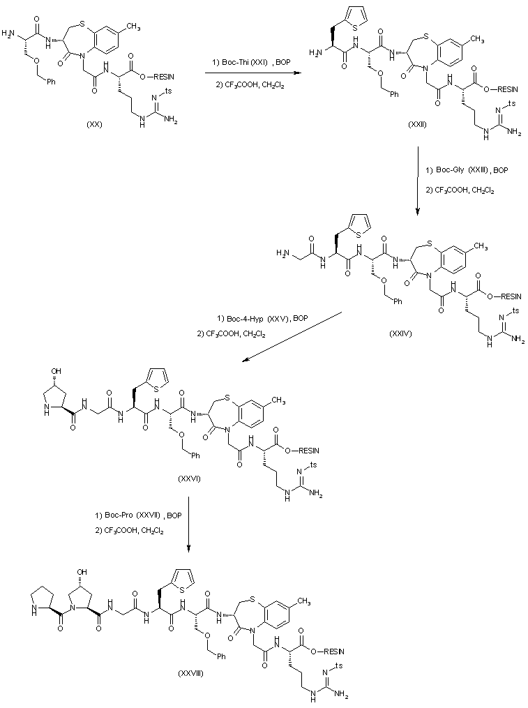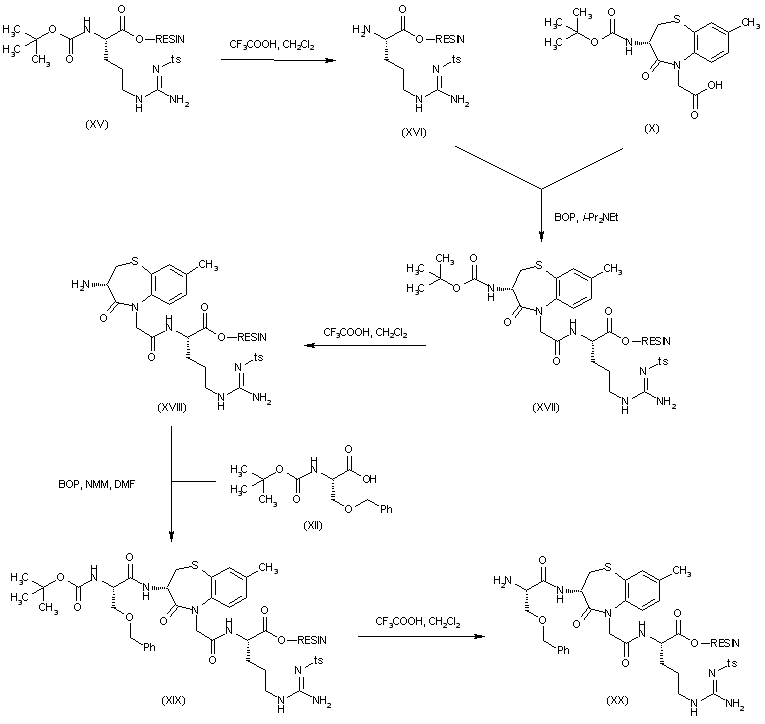 Construction of the peptide chain was carried out by solid phase synthesis on a Merrifield resin. The protected arginine bound to the resin (XV) was treated with trifluoroacetic to cleave the N-Boc group. The resulting NG-arginine-resin (XVI) was coupled with benzothiazepineacetic acid (X) by means of BOP reagent to produce (XVII). After deprotection of the Boc group of (XVII) with trifluoroacetic acid, further coupling with protected serine (XII) gave peptide resin (XIX). The Boc group of (XIX) was then deprotected with trifluoroacetic acid as above to furnish intermediate (XX).