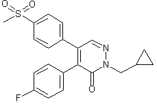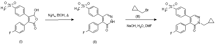 Cyclization of hydroxyfuranone (I) with hydrazine in refluxing EtOH produced the pyridazinone (II), which was subsequently alkylated with cyclopropylmethyl bromide (III) in the presence of NaOH to afford the title compound.