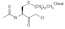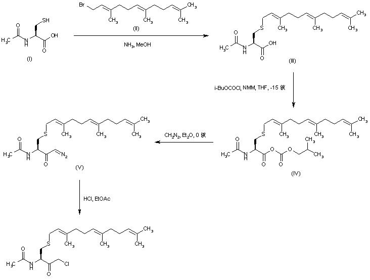 The alkylation of N-acetyl-L-cysteine (I) with farnesyl bromide (II) in methanolic ammonia provided the corresponding farnesyl thioether (III). After activation of the S-alkylated acid (III) as the mixed anhydride (IV) using isobutyl chloroformate and N-methylmorpholine, reaction with diazomethane yielded the diazomethyl ketone (V). This was then converted into the title chloromethyl ketone by treatment with HCl in ethyl acetate.