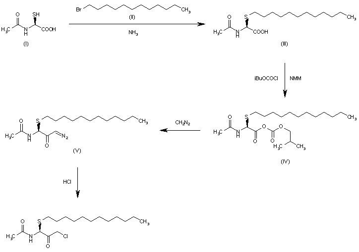 The alkylation of N-acetyl-L-cysteine (I) with dodecyl bromide (II) by means of ammonia in methanol gives N-acetyl-S-dodecyl-L-cysteine (III), which is treated with isobutyl chloroformate and N-methylmorpholine (NMM) in THF yielding the mixed anhydride (IV). The reaction of (IV) with diazomethane in ethyl ether affords the diazoketone (V), which is finally treated with HCl in ethyl acetate.