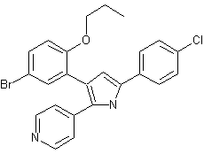 Aldol condensation of 5-bromo-2-propoxybenzaldehyde (I) with 4'-chloroacetophenone in the presence of NaOH produced chalcone (III) (1), which was condensed with pyridine-4-carbaldehyde (IV) using NaCN as the catalyst to yield diketone (V). Finally, the target pyrrole was constructed by Paal-Knorr synthesis using diketone (V) and ammonium acetate in boiling AcOH.