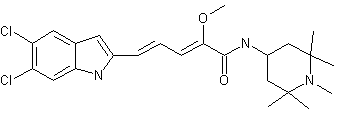 3,4-Dichlorotoluene (I) was nitrated with HNO3 in H2SO4, and the resulting nitrotoluene (II) was condensed with diethyl oxalate in the presence of KOEt to give the phenylpyruvic derivative (III). Then, reductive cyclization of (III) with Fe and AcOH produced ethyl 5,6-dichloroindole-2-carboxylate (IV). Further reduction of (IV) with LiAlH4 yielded alcohol (V), which was oxidized to aldehyde (VI) with MnO2 in Et2O. Horner-Emmons reaction of (VI) with triethyl phosphonoacetate (VII) afforded the indolylpropenoate (VIII). This was reduced to the allyl alcohol (IX) with DIBAL-H, and subsequently oxidized with MnO2 to afford the propenaldehyde (X). In a shorter procedure, Wittig reaction of (VI) with formylmethylene triphenylphosphorane (XI) yielded also propenaldehyde (X) along with the homologated pentadienaldehyde. Phosphonium bromide (XIV) was prepared by bromination of methyl methoxyacetate (XII) with NBS in the presence of dibenzoyl peroxide, followed by condensation of the resulting bromide (XIII) with PPh3. Wittig reaction of this phosphonium reagent with aldehyde (X) in the presence of DBU in boiling THF gave ester (XV). Subsequent saponification of (XV) with ethanolic KOH yielded acid (XVI). The aminopiperidine (XX) was synthesized by N-methylation of tetramethylpiperidone (XVII), followed by formation of the oxime (XIX) and catalytic reduction over Rh/C. Then, condensation of amine (XX) with acid (XVI) using 1-ethyl-3-(dimethylaminopropyl)carbodiimide-HCl (EDC) and 1-hydroxy-7-azabenzotriazole (HOAt) in DMF furnished the target compound.