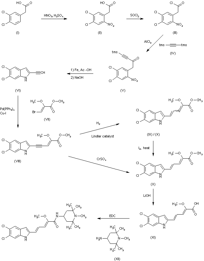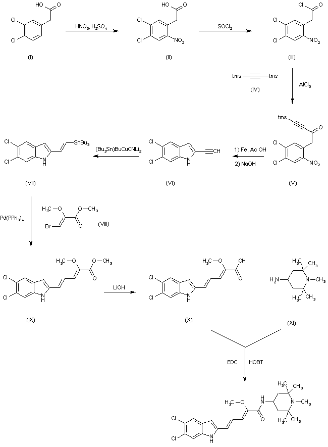 The nitration of 2-(3,4-dichlorophenyl)acetic acid (I) with HNO3 and H2SO4 gives 2-(4,5-dichloro-2-nitrophenyl)acetic acid (II), which is treated with refluxing SOCl2 to yield the corresponding acyl chloride (III). The condensation of (III) with bis(trimethylsilyl)acetylene (IV) by means of AlCl3 in dichloromethane affords 1-(2-nitro-4,5-dichlorophenyl)-4-(trimethylsilyl)-3-butyn-2-one (V), which is submitted to a reductive cyclization by means of Fe/AcOH to provide 5,6-dichloro-2-ethynyl-1H-indole (VI) after desilylation with NaOH in methanol. The reaction of (VI) with (Bu3Sn)BuCuCNLi2 gives 5,6-dichloro-2-[2(E)-(tributylstannyl)vinyl]-1H-indole (VII), which is condensed with methyl 3-bromo-2-methoxy-2-propenoate (VIII) by means of Pd(PPh3)4 in hot THF to yield the pentadienoic ester (IX). The hydrolysis of (IX) with LiOH in MeOH affords the corresponding carboxylic acid (X), which is finally condensed with the amine (XI) by means of EDC and HOBT in dichloromethane to provide the target amide.