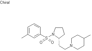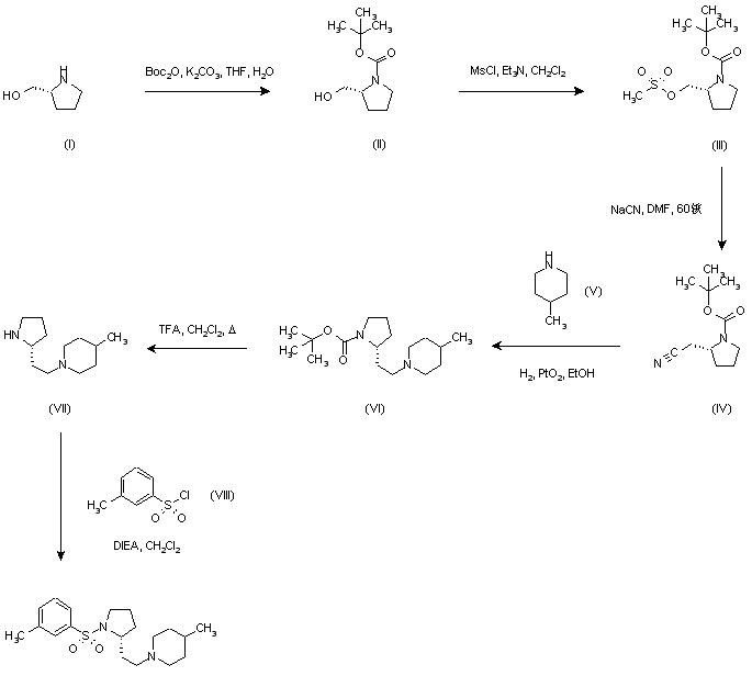 | 合成路线图解说明: Treatment of (R)-2-pyrrolidine methanol (I) with di-tert-butyl dicarbonate and K2CO3 gave carbamate (II), which was converted to mesylate (III) using methanesulfonyl chloride and Et3N. Subsequent reaction of (III) with NaCN in DMF provided nitrile (IV). The catalytic hydrogenation of this nitrile in the presence of 4-methylpiperidine (V) furnished the (piperidinylethyl)pyrrolidine (VI). After Boc deprotection of (VI) with trifluoroacetic acid in refluxing CH2Cl2, the resulting pyrrolidine (VII) was finally condensed with m-toluenesulfonyl chloride (VIII) to give the target sulfonamide. |