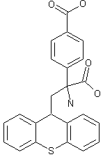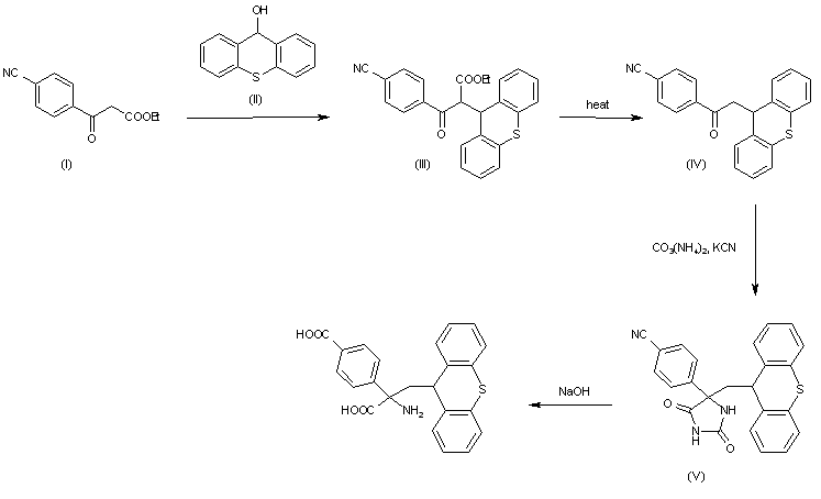 The condensation of ethyl 2-(4-cyanobenzoyl)acetate (I) with 9-hydroxythioxanthene (II) in ethanol/acetic acid gives ethyl 2-(4-cyanobenzoyl)-2-(thioxanthen-9-yl)acetate (III), which is decarboxylated in refluxing DMSO/water yielding 4-[2-(thioxanthen-9-yl)acetyl]benzonitrile (IV). The cyclization of (IV) with ammonium carbonate and potasium cyanide affords the hydantoin (V), which is finally fully hydrolyzed with aqueous NaOH at 120 C.