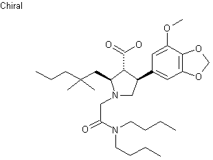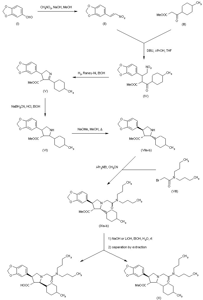 Condensation of piperonal (I) with nitromethane in the presence of NaOH provided nitrostyrene (II) (1-3). Ketoester (IV) was prepared by treatment of n-heptanoic acid (III) with 1,1'-carbonyldiimidazole and further condensation with ethyl magnesium malonate (1). Subsequent conjugate addition of (II) to ketoester (IV) using DBU provided adduct (V). Reduction of the nitro group of (V), with concomitant ring closure formed the cyclic imine (VI), which was reduced with NaBH3CN to yield the pyrrolidine (VII) as a diastereomeric mixture. The crude mixture was isomerized to a mixture of only cis,trans and trans,trans pyrrolidines (VIII) by base-catalyzed equilibration with NaOEt. N-Alkylation of the pyrrolidines (VIII) with N,N-dibutyl bromoacetamide (IX) furnished (X). Basic hydrolysis of the ester group of (X) with either NaOH or LiOH gave rise to the target trans,trans pyrrolidine-3-carboxylic acid. The undesired cis,trans isomeric ester (XI) was not hydrolyzed under these conditions, allowing its removal from the product by means of differential extraction.