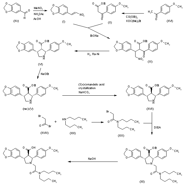 Condensation of 1,3-benzodioxole-5-carbaldehyde (XV) with nitromethane by means of ammonium acetate in HOAc gives the nitrostyrene (I), which is condensed with ethyl 2-(4-methoxybenzoyl)acetate (II) [obtained by reaction of acetophenone (XVI), diethyl carbonate and potassium tert-amyloxide] by means of NaOEt in THF to yield the 4-nitrobutyrate (III). Reductive cyclization of (III) with H2 over Raney-Ni in THF affords the (cis, cis)-pyrrolidine (VI), which is isomerized to the (trans,trans)-isomer (V) by means of NaOEt in refluxing ethanol. This racemic ester (V) is submitted to optical resolution with (S)-(+)-mandelic acid to provide the pure chiral ester (XVII). This compound is condensed with 2-bromo-N,N-dibutylacetamide (XIII) [obtained by reaction of 2-bromoacetyl bromide (XVIII) with dibutylamine (XIX) in toluene] by means of DIEA in acetonitrile to give the ethyl ester (XX), which is finally hydrolyzed with NaOH in hot ethanol.