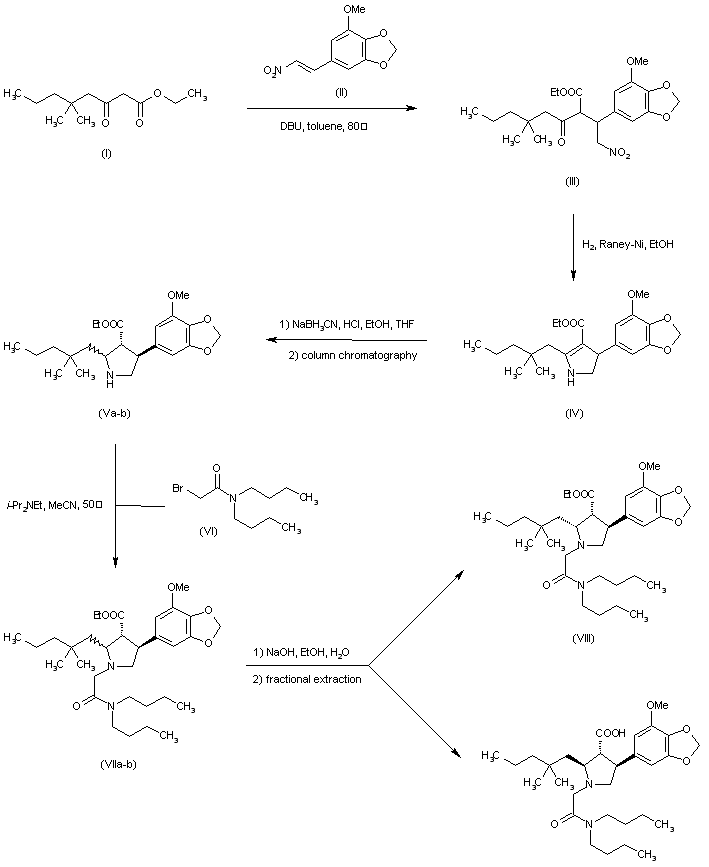Condensation of ketoester (I) with nitrovinyl benzodioxole (II) in the presence of 1,8-diazabicyclo[5.4.0]undec-7-ene gave adduct (III). Hydrogenation of the nitro group of (III) over Raney Nickel with concomitant cyclization yielded dihydropyrrole (IV). Further reduction of (IV) with sodium cyanoborohydride provided a mixture of diastereomeric pyrrolidines. Chromatographic separation removed the cis,cis isomer, affording a mixture of trans,trans and cis,trans products (V). N-Alkylation of the pyrrolidine (V) with N,N-dibutyl bromoacetamide (VI) furnished (VIIa-b). Finally, selective hydrolysis of the ester group from the trans,trans isomer produced a mixture of cis,trans ester (VIII) and the target trans,trans acid, which were readily separated by fractional extraction.