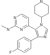 Condensation between p-fluorobenzaldehyde (I), p-toluenesulfinic acid (II) and formamide in the presence of camphorsulfonic acid afforded 4-fluorophenyltosylmethyl formamide (III). Subsequent dehydration of (III) by means of POCl3 and Et3N produced isonitrile (IV). Imine (VII) was prepared by condensation of pyridine-4-carboxaldehyde (V) with 1-Boc-4-aminopiperidine (VI) using MgSO4 as the dehydrating reagent. Dipolar cycloaddition of this imine with the anion of tosyl isonitrile (IV) generated the trisubstituted imidazole (VIII). Finally, acid cleavage of the Boc protecting group furnished the title compound.