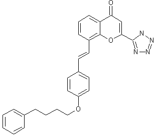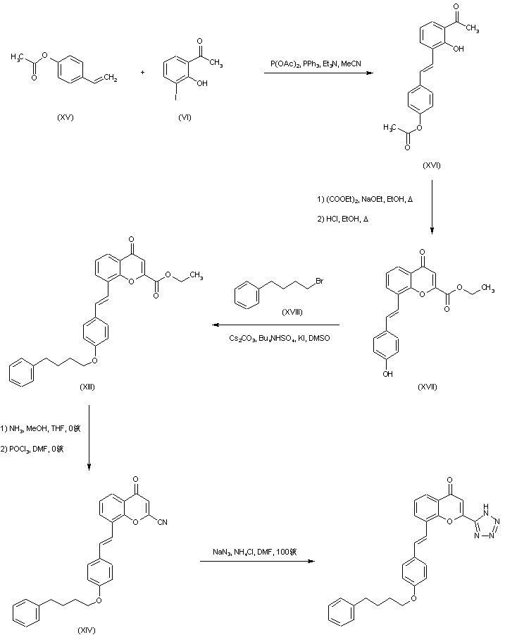 4-Bromophenol (I) was acetylated with Ac2O and Et3N, and the resulting 4-bromophenyl acetate (II) was rearranged to 5'-bromo-2'-hydroxyacetophenone (III) in the presence of AlCl3 at 120 C. Subsequent nitration of (III) produced the 3'-nitroacetophenone (IV). The catalytic hydrogenation of the nitro group of (IV), with simultaneous halogen hydrogenolysis, furnished 3'-amino-2'-hydroxyacetophe-none (V). Then, diazotization of the amine group of (V), followed by treatment with KI and Cu powder gave iodide (VI). Coupling of 4-phenyl-1-butanol (VII) with 4-hydroxybenzaldehyde (VIII) under Mitsunobu conditions provided 4-(4-phenylbutoxy)benzaldehyde (IX). Further Wittig reaction of (IX) with methylene triphenylphosphorane (X) gave the styrene (XI). This was condensed with the iodoacetophenone (VI) in the presence of Pd(OAc)2 to produce the stilbene derivative (XII). The benzopyranone (XIII) was prepared by condensation of hydroxyacetophenone (XII) with diethyl oxalate in the presence of NaOEt, followed by acid cyclization. After conversion of the ester function of (XIII) to the corresponding amide with methanolic ammonia, dehydration using POCl3 in DMF afforded nitrile (XIV). The required tetrazole ring was finally obtained by reaction with NaN3 and NH4Cl in DMF at 100 C.