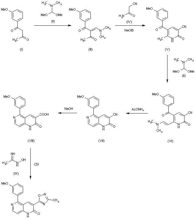 The reaction of 3-methoxybenzoylacetone (I) with dimethylformamide dimethylacetal (II) gives the dimethylaminomethylene derivative (III), which is cyclized with 2-cyanoacetamide (IV) by means of sodium ethoxide in ethanol yielding the pyridinone (V). The condensation of (V) with dimethylformamide dimethylacetal (II) affords the dimethylaminovinylpyridinone (VI), which is cyclized by means of ammonium acetate in DMF providing the 1,6-naphthyridine (VII). The hydrolysis of the cyano group of (VII) with NaOH gives the corresponding carboxylic acid (VIII), which is finally cyclized with N-hydroxyacetamidine (IX) by means of carbonydimidazole (CDI).