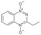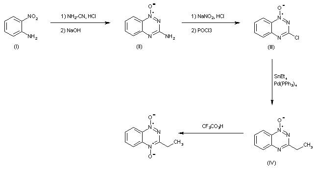 The reaction of 2-nitroaniline (I) with cyanamide and HCl at 100 C, followed by a treatment with NaOH at the same temperature gives the benzotriazine N-oxide (II), which is diazotized with NaNO2 and HCl, followed by a treatment with POCl3 and dimethylaniline to yield the chloro derivative (III). The reaction of (III) with tetraethyltin and Pd(PPh3)4 in hot DME affords the ethyl derivative (IV), which is finally oxidized with trifluoroperacetic acid in dichloromethane to provide the target N1, N4-bis oxide compound.
