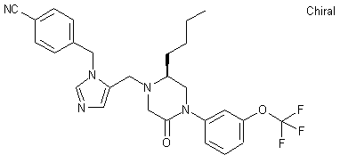 The reaction of N-(tert-butoxycarbonyl)-L-norleucine (I) with N,O-dimethylhydroxylamine (II) by means of EDC, HOBT and TEA in DMF gives the methoxyamide (III), which is reduced with LiAlH4 to the corresponding aldehyde (IV). The reductocondensation of (IV) with 3-(trifluoromethoxy)aniline (V) by means of NaBH(OAc)3 affords the secondary amine (VI), which is acylated with chloroacetyl chloride (VII) and NaHCO3 to the chloroacetamide (VIII). The cyclization of (VIII) by means of Cs2CO3 in DMF gives the piperazinone (IX), which is finally reductocondensed with 1-(4-cyanobenzyl)imidazole-5-carbaldehyde (X) by means of NaBH(OAc)3. The intermediate 1-(4-cyanobenzyl)imidazole-5-carbaldehyde (X) has been obtained as follows: The tritylation of 1H-imidazole-4-methanol (XI) with trityl chloride and TEA in DMF gives the corresponding 1-trityl derivative (XII), which is acetylated with Ac2O and pyridine yielding the acetate (XIII). The condensation of (XIII) with 4-(bromomethyl)benzonitrile (XIV) in hot ethyl acetate affords 4-(5-acetoxyimidazol-1-ylmethyl)benzonitrile (XV), which is hydrolyzed with LiOH in THF/water providing the carbinol (XVI). Finally, this alcohol is oxidized to the target aldehyde (X) by means of SO3 and pyridine in DMSO.
