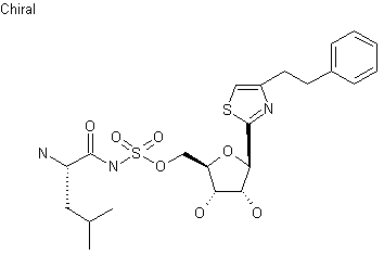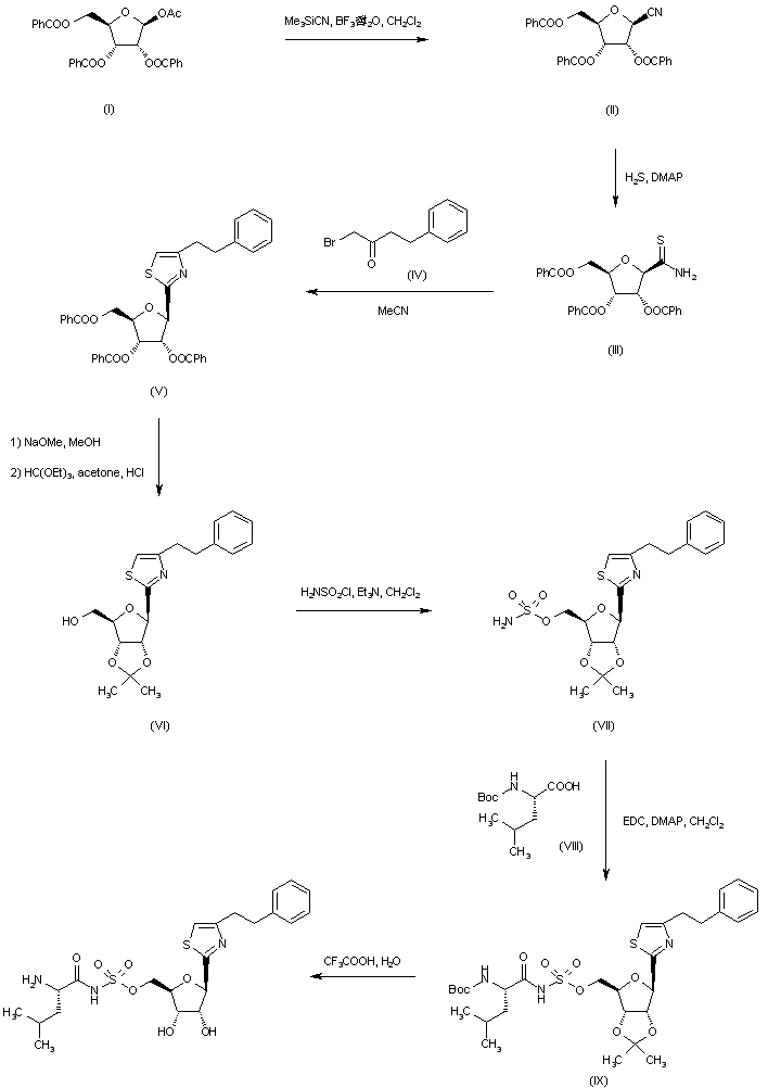 Reaction of 1-O-acetyl-2,3,5-tri-O-benzoyl-beta-D-ribofuranose (I) with trimethylsilyl cyanide in the presence of boron trifluoride gave nitrile (II), which was treated with liquid hydrogen sulfide and DMAP to yield thioamide (III). Condensation of this thioamide with bromoketone (IV) in acetonitrile afforded the thiazole derivative (V). Hydrolysis of the benzoate esters of (V) using sodium methoxide in methanol, followed by protection of the resulting 2,3-diol with acetone and triethyl orthoformate produced the corresponding isopropylidene ketal (VI). Treatment of the primary alcohol group of (VI) with sulfamoyl chloride gave rise to the sulfamate ester (VII). Further condensation of (VII) with N-Boc-L-leucine furnished (IX). The Boc and isopropylidene groups of (IX) were finally eliminated with trifluoroacetic acid to provide the title compound.