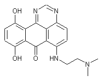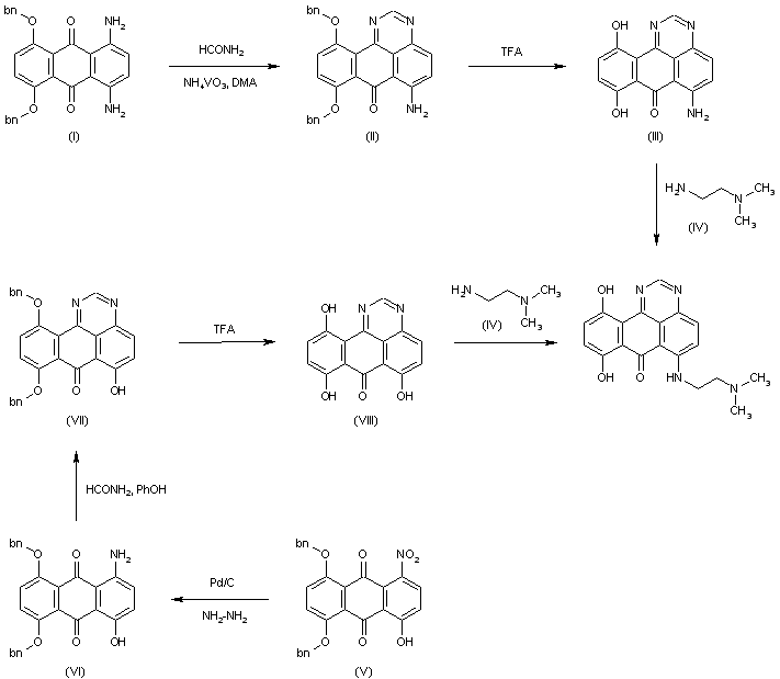 The cyclization of anthracenedione derivative (I) with formamide in refluxing dimethylacetamide (DMA) in the presence of NH4VO3 affords benzo[e]perimidinone derivative (II), whose benzyl groups are removed with TFA to yield (III). Intermediate (III) is finally heated with 2-(dimethylamino)ethylamine (IV) in N,N,N',N'-tetramethylethylenediamine and a small amount of water. Alternatively, the target product can be obtained as follows: Reduction of the nitro group of anthracenedione derivative (V) by means of hydrazine and Pd/C provides amine (VI), which is then cyclized with formamide in phenol to give (VII). The removal of the benzyl groups of (VII) by treatment with TFA yields intermediate (VIII), which is finally condensed with 2-(dimethylamino)ethylamine (IV) under similar conditions as described for (III).