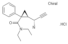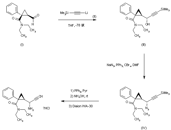 Addition of lithium trimethylsilylacetylide (II) to chiral cyclopropane- carbaldehyde (I) gave propargyl alcohol (III). This was condensed with NaN3 in the presence of CBr4 and PPh3 to provide azide (IV) with retention of configuration. Subsequent treatment of (IV) with PPh3 in pyridine, and then with aqueous ammonia furnished the desired amine, which was isolated as the hydrochloride salt after chromatography over Diaion WA-30 resin.