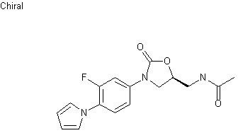 The reaction between pyrrole (I) and 3,4-difluoronitrobenzene (II) afforded the N-aryl pyrrole (III). Selective reduction of the nitro group of (III) by hydrogenation over sulfided platinum on carbon gave aniline (IV), which was converted to carbamate (V) upon treatment with benzyl chloroformate. Subsequent condensation of (V) with (R)-(-)-glycidyl butyrate (VI) in the presence of lithium bis(trimethylsilyl)amide produced the chiral oxazolidinone (VII). Mesylation of the alcohol group of (VII), followed by displacement with NaN3 yielded azide (VIII). This was reduced by hydrogenation over Pt/C/S to give amine (IX), which was finally acetylated using Ac2O and pyridine.