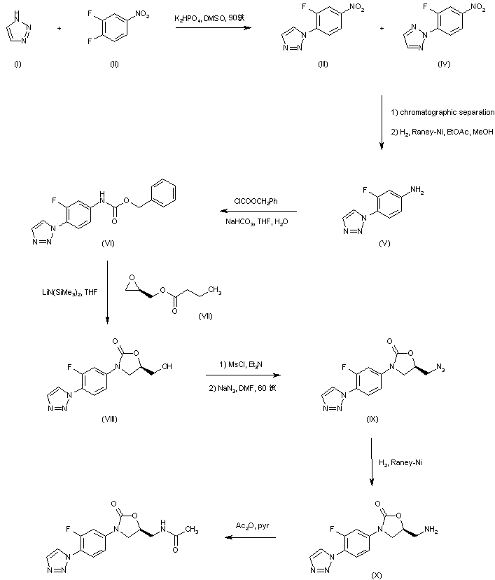 The reaction between 1,2,3-triazole (I) and 3,4-difluoronitrobenzene (II) afforded a mixture of two regioisomeric substituted triazoles (III) and (IV), from which the required 1-substituted isomer (III) was isolated by column chromatography. Reduction of the nitro group of (III) by hydrogenation over Raney-Ni gave aniline (V), which was converted to carbamate (VI) upon treatment with benzyl chloroformate. Subsequent condensation of (VI) with (R)-(-)-glycidyl butyrate (VII) in the presence of lithium bis(trimethylsilyl)amide produced the chiral oxazolidinone (VIII). Mesylation of the alcohol group of (VIII), followed by displacement with NaN3 yielded azide (IX). This was reduced by hydrogenation over Raney-Ni to give amine (X), which was finally acetylated using Ac2O and pyridine.
