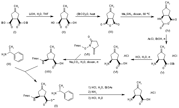 Basic hydrolysis of cis-4-methylenecyclopentane-1,2-dicarboxylic acid diethyl ester (I) with LiOH gives the free acid (II), which by refluxing with propionic anhydride yields the cyclic anhydride (III). Rearrangement using trimethylsilyl azide in dioxane at 80 C produces the oxazinedione (IV), which is hydrolyzed to (?-cis-2-amino-4-methylenecyclopentane-1-carboxylic acid ethyl ester (V) by means of acetyl chloride in EtOH. Further hydrolysis of ester (V) with aqueous HCl provides the racemic amino acid (VI), which is coupled with N-(9-fluorenylmethoxycarbonyl)succinimide (VII) to afford the Fmoc-amino acid (VIII). Racemic (VIII) is resolved by treatment with (+)-(R)-1-phenylethylamine (IX) and crystallization of the resulting salt (X) in EtOH/methyl tert-butyl ether. Finally, acidification of salt (X) and extraction of the (1R,2S)-free acid, followed by removal of the Fmoc group with liquid ammonia, provides PLD-118 isolated as its hydrochloride salt.