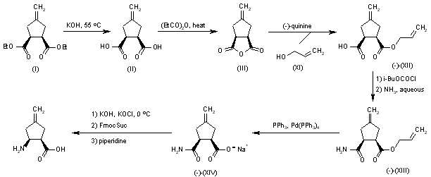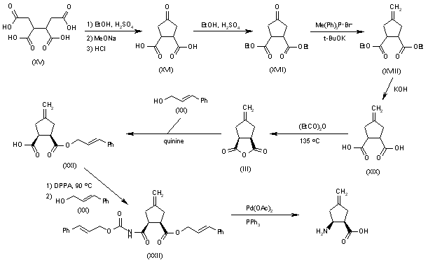 Cyclization of the tetracarboxylic acid (XV) gives 4-oxocyclopentane-1,2-dicarboxylic acid (XVI), which is esterified with ethanol and sulfuric acid to yield the diester (XVII). Reaction of diester (XVII) with methyl-(triphenyl)phosphonium bromide and t-BuOK in THF affords 4-methylenecyclopentane-1,2-dicarboxylic acid diethyl ester (XVIII), which is hydrolyzed with KOH in THF/water to provide the corresponding free acid (XIX). The anhydrization of (XIX) by means of propionic anhydride at 135 C gives anhydride (III), which is submitted to an enantioselective quinine-mediated alcoholysis with 3-phenyl-2-propen-1-ol (XX) to yield (1R,2S)-2-amino-4-methylenecyclopentane-1-carboxylic acid 3-phenyl-2-propenyl monoester (XXI). Degradation of the free carboxylic acid group of (XXI) by means of DPPA, TEA and alcohol (XX) in hot toluene affords carbamate (XXII), which is finally fully deprotected with Pd(OAc)2 and PPh3 in ethanol.