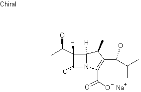 Azetidinepropanoic acid derivative (I) was converted to the mixed anhydride with isobutyl chloroformate and then coupled with N,O-dimethylhydroxylamine to afford the N-methoxyamide (II). This was treated with 2-thiazolylmagnesium bromide (III) to give thiazolyl ketone (IV). Condensation of (IV) with allyl glyoxylate hydrate (V) produced adduct (VI). Further reaction of (VI) with SOCl2 and then with triphenylphosphine gave the corresponding phosphorane, which cyclized in boiling anisole to generate the carbapenem (VII). After N-methylation at the thiazole ring of (VII) with methyl triflate, the thiazolium salt (VIII) was reduced with NaBH4 and subsequently hydrolyzed to aldehyde (IX) in the presence of HgCl2. Addition of isopropylmagnesium bromide to (IX) at -78 C, followed by desilylation with tetra-butylammonium fluoride yielded diol (X). Finally, palladium-catalyzed deprotection of the allyl ester of (X) in the presence of sodium 2-ethylhexanoate provided the title sodium carboxylate salt.