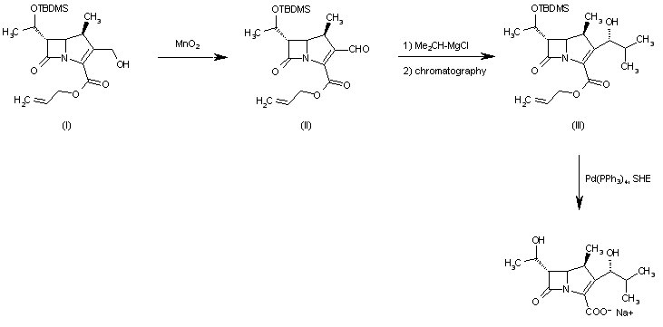 The oxidation of the hydroxymethyl carbapenem (I) with MnO2 in refluxing dichloromethane gives the corresponding aldehyde (II), which is treated with isopropylmagnesium chloride in THF yielding, after chromatographic separation, the 1(R)-hydroxy-2-methylpropyl derivative (III). Finally, this compound is deprotected with Pd(PPh3)4 and converted to the sodium salt with sodium 2-ethylhexanoate (SHE).