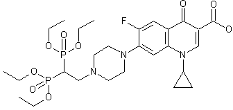 The condensation of 1-cyclopropyl-6-fluoro-4-oxo-7-(1-piperazinyl)-1,4-dihydroquinoline-3-carboxylic acid (I) with methylenediphosphonic acid tetraethyl ester (II) by means of TEA gives the addition product (III), which is finally hydrolyzed with trimethylsilyl bromide and water to afford the target diphosphonic acid.