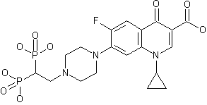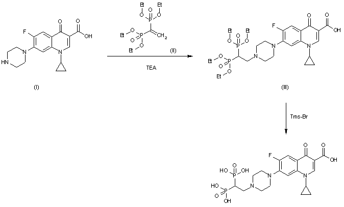 The condensation of 1-cyclopropyl-6-fluoro-4-oxo-7-(1-piperazinyl)-1,4-dihydroquinoline-3-carboxylic acid (I) with methylenediphosphonic acid tetraethyl ester (II) by means of TEA gives the addition product (III), which is finally hydrolyzed with trimethylsilyl bromide and water to afford the target diphosphonic acid.