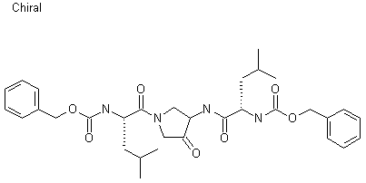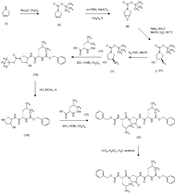3-Pyrroline (I) was protected with di-tert-buyl dicarbonate to give N-Boc-pyrroline (II), which was then epoxidized with meta-chloroperbenzoic acid. The resulting epoxide (III) was opened with sodium azide in aqueous MeOH to yield trans-azidoalcohol (IV). Subsequent reduction of the azide (IV) to aminoalcohol (V) was effected by hydrogenation over Pd/C (1). Condensation of the racemic trans-aminoalcohol (V) with N-Cbz-L-leucine (VI) in the presence of EDC and HOBt provided amide (VII) as a diastereomeric mixture. The N-Boc group of (VII) was then deprotected with HCl in EtOAc, and the resulting amine (VIII) was coupled with another N-Cbz-L-leucine (VI) unit to give (IX). Oxidation of the alcohol group of (IX) to the target ketone was accomplished with Jones reagent in acetone. The diastereomeric mixture was separated by reverse phase-HPLC, however the diastereomers were not configurationally stable and reequilibrated spontaneusly to the original mixture.
