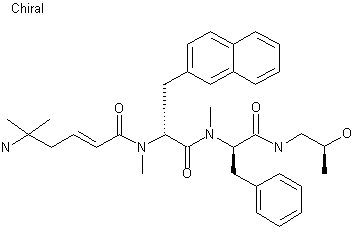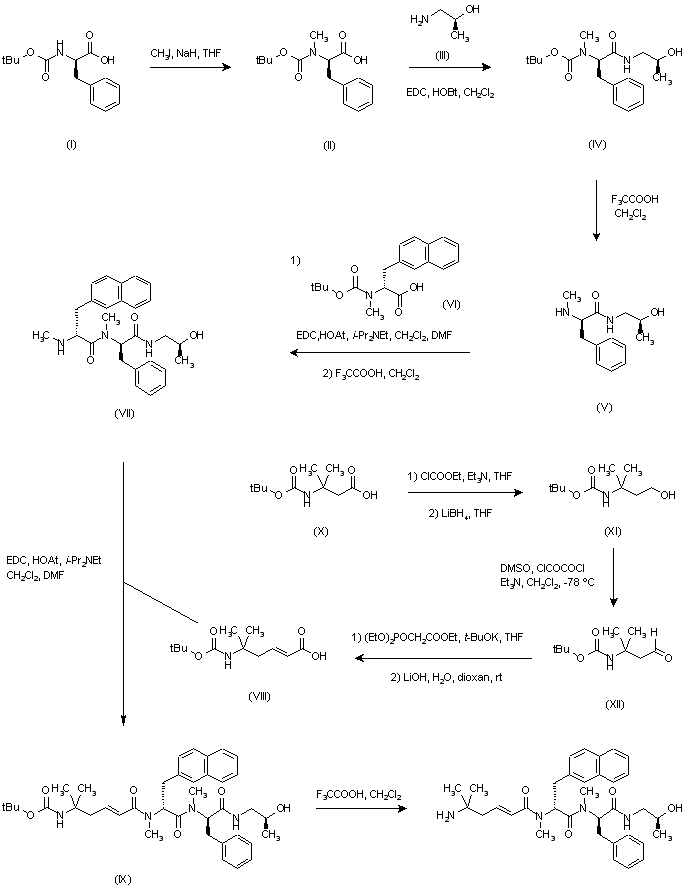 Amino acid (II) (obtained by N-alkylation of N-Boc-D-phenylalanine (I) with MeI), was coupled to (S)-1-amino-2-propanol (III) using 1-ethyl-3-(3-dimethylaminopropyl)carbodiimide-HCl (EDC) and 1-hydroxybenzotriazole to give amide (IV). The N-Boc group of (IV) was then deprotected with trifluoroacetic acid in CH2Cl2 to afford (V). Further coupling of (V) with D-naphthylalanine derivative (VI), followed by Boc deprotection with trifluoroacetic acid, provided dipeptide amide (VII). This dipeptide was coupled to intermediate amino acid (VIII) using EDC and 1-hydroxy-7-azabenzotriazole yielding tripeptide (IX). Finally, trifluoroacetic acid-promoted Boc-deprotection of (IX) provided the target compound. Intermediate amino acid (VIII) was prepared from 3-(tert-butoxycarbonylamino)-3-methylbutanoic acid (X) upon conversion to the mixed anhydride with ethyl chloroformate, followed by reduction to alcohol (XI) with LiBH4. Subsequent Swern oxidation of the alcohol (XI) furnished aldehyde (XII). This was condensed with triethyl phosphonoacetate, and then saponified with LiOH to produce the intermediate (VIII).