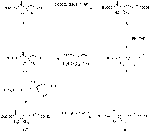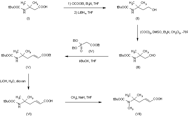 Reduction of N-Boc-3-amino-3-methylbutanoic acid (I) to alcohol (II) was achieved via formation of the corresponding mixed anhydride with ethyl chloroformate, followed by treatment with LiBH4. Swern oxidation then produced aldehyde (III), which was subjected to a Horner-Emmons condensation with triethyl phosphonoacetate (IV) to afford unsaturated ester (V). Ester hydrolysis with LiOH yielded carboxylic acid (VI). Subsequent alkylation of (VI) with methyl iodide and NaH furnished de N-methyl derivative (VII).
