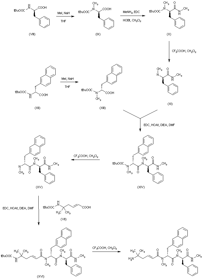 Methylation of N-Boc-D-phenylalanine (VIII) with methyl iodide and NaH afforded the N-methyl amino acid (IX). After coupling with methylamine in the presence of EDC and HOBt, the Boc protecting group of the resulting amide (X) was removed by treatment with trifluoroacetic acid to give (XI). The N-methyl amino acid (XIII), prepared by methylation of N-Boc-naphthylalanine (XII), was then coupled to amine (XI) by means of EDC and HOAt to yield dipeptide amide (XIV). A further treatment of (XIV) with trifluoroacetic acid removed the Boc protecting group to yield (XV), which was then coupled with amino acid (VII) in the presence of EDC and HOAt yielding (XVI). Finally, deprotection of the Boc-tripeptide (XVI) with trifluoroacetic acid provided the title compound.