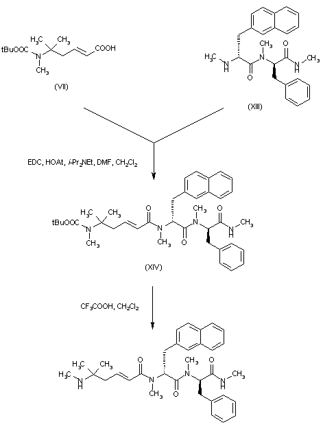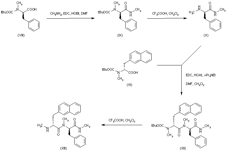 The condensation of N-Boc-N-methyl-D-phenylalanine (VIII) with methylamine by means of EDC and HOBt gave the corresponding amide (IX). After acid deprotection of the Boc group of (IX), the resulting amino compound (X) was coupled with N-Boc-N-methyl-D-naphthylalanine (XI) using EDC and HOAt to provide dipeptide (XII). The Boc protecting group of (XII) was further cleaved with trifluoroacetic acid to give (XIII).