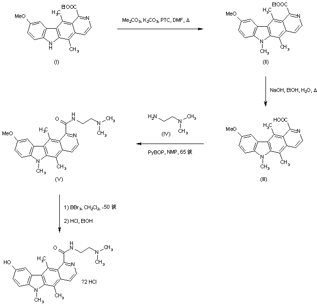 The known pyridocarbazole (I) was methylated to (II) using dimethyl carbonate as the alkylating agent in the presence of K2CO3 and the phase-transfer catalyst adogen-464. For the preparation of the required amide (V), the ester group of (III) was first hydrolyzed with NaOH to the carboxylic acid (III), which was then coupled with 2-(dimethylamino)ethyl amine (IV) by means of (benzotriazol-1-yloxy)tripyrrolidinophosphonium hexafluorophosphate (PyBOP) in hot N-methylpyrrolidone yielding (V). Finally, cleavage of the methyl ether of (V) with BBr3 provided the title compound.