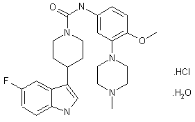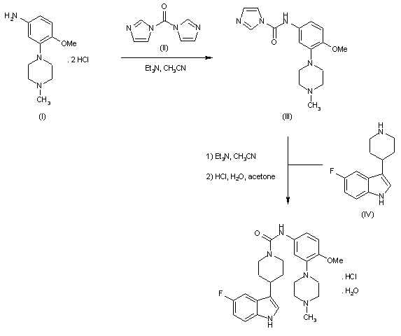 Treatment of 4-methoxy-3-(4-methylpiperazin-1-yl)aniline dihydrochloride (I) with 1,1'-carbonyldiimidazole (II) gave the intermediate imidazolide (III) which, upon treatment with 4-(5-fluoro-1H-indol-3-yl)piperidine (IV) afforded the unsymmetrical urea. Finally, treatment with HCl in acetone yielded the title hydrochloride salt.