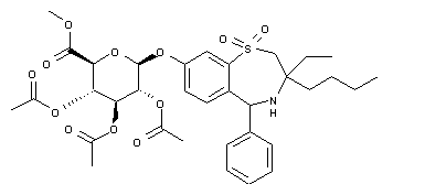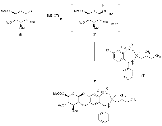 By condensation of D-glucopyranuronic acid methyl ester (I) with 3-butyl-3-ethyl-5-phenyl-2,3,4,5-tetrahydro-1,4-benzothiazepin-8-ol S,S-dioxide (III) by means of Tms-OTf.