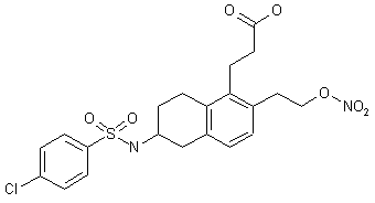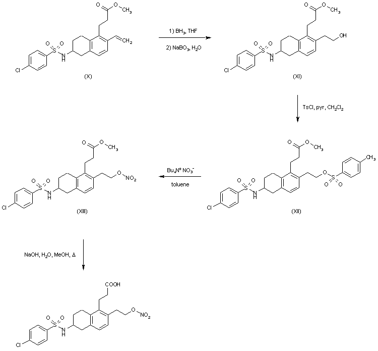 Hydroboration of the vinyl group of (X), followed by oxidative treatment with sodium perborate furnished alcohol (XI), which was further activated as the corresponding tosylate (XII). Displacement of the tosylate group of (XII) with tetrabutylammonium nitrate in toluene gave nitrate ester (XIII). The methyl ester group of (XIII) was finally hydrolyzed with NaOH to the target carboxylic acid.