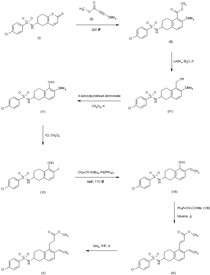 Diels-Alder condensation of benzopyran (I) with methyl (trimethylsilyl)propynoate (II) gave rise to tetrahydronaphthalene (III). After reduction of the ester group of (III) with LiAlH4, the resulting alcohol (IV) was further oxidized to aldehyde (V) by means of 4-benzylpyridinium dichromate. Treatment of (V) with iodine monochloride produced iodonaphthalene (VI). Subsequent reaction of (VI) with vinyl tributyltin and palladium tetrakis(triphenylphosphine) yielded the vinyl naphthalene (VII). Wittig reaction of (VIII with (carbomethoxymethylidene)triphenylphosphorane (VIII) gave the arylpropenoate ester (IX), which was reduced to the saturated ester (X) employing samarium iodide.