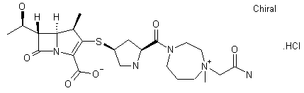 Mercaptoproline derivative (I) was condensed with N-(carbamoylmethyl)homopiperazine (II) via activation with carbonyl diimidazole to afford amide (III). The 4-methoxybenzyl group of (III) was then removed with trifluoromethanesulfonic acid in the presence of anisole and trifluoroacetic acid, and the resulting mercaptan (IV) was condensed with carbapenem phosphate (VI), (prepared from ketone (V) and diphenylphosphorochloridate), to afford thioether (VII). N-Methylation of (VII) was carried out using methyl fluorosulfonate to yield quaternary ammonium salt (VIII). Finally, the 4-nitrobenzyl ester and carbamate groups of (VIII) were eliminated by hydrogenation in the presence of Pd/C, and the target product was isolated by ion-exchange chromatography.