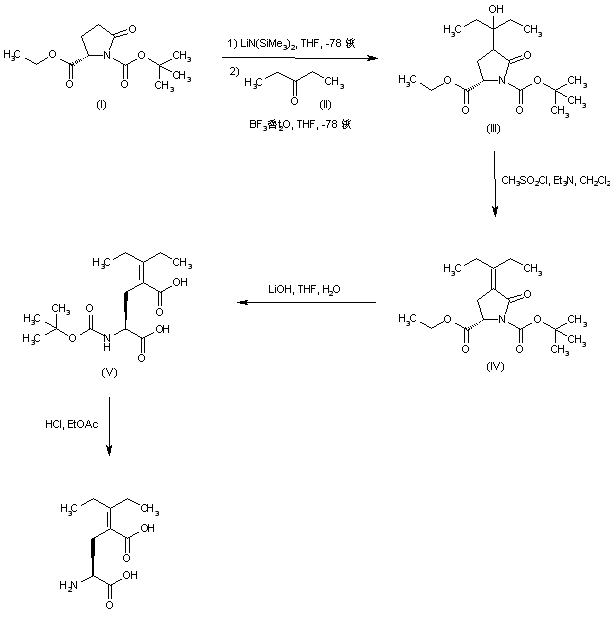 Treatment of ethyl N-Boc-(S)-pyroglutamate (I) with lithium hexamethyldisilazide in THF at -78 C, followed by aldol condensation of the resulting lithium enolate with 3-pentanone (II) in the presence of boron trifluoride etherate, furnished adduct (III). Dehydration of the alcohol group of (III) to produce olefin (IV) was achieved by treatment of (III) with methanesulfonyl chloride and triethylamine. Hydrolysis of the ester and lactam groups of (IV) by means of LiOH afforded diacid (V). The N-Boc group of (V) was finally cleaved with HCl in EtOH.